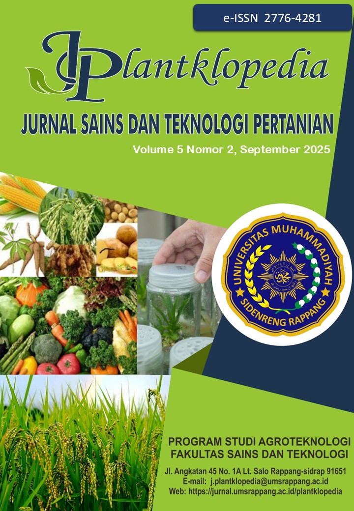 PLANTKLOPEDIA: Jurnal Sains dan Teknologi Pertanian adalah jurnal ilmiah yang menyajikan informasi hasil penelitian dan artikel ilmiah di bidang Pertanian dan Perkebuna meliputi bidang Agronomi, Agribisnis, Budidaya Tanaman, Ilmu Tanah, Ilmu Hama dan Penyakit Tanaman, Teknologi Benih, Bioteknologi, Pemuliaan Tanaman, serta Tanaman Pangan dan Hortikultura dari berbagai aspek yang dipublikasikan secara elektronik.